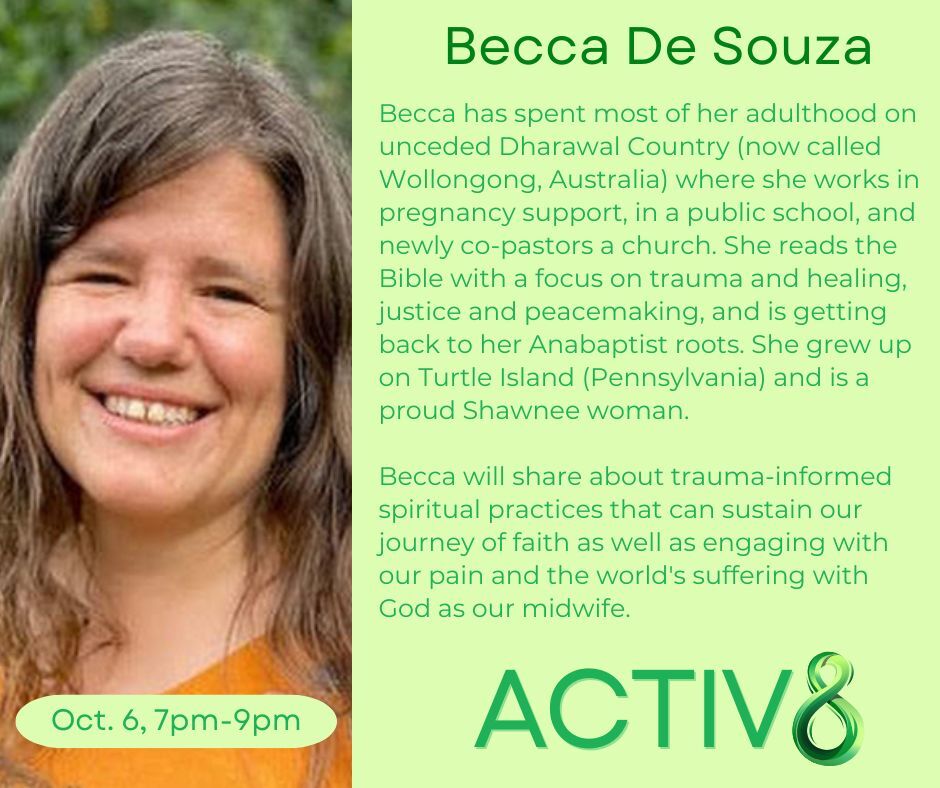 Activ8 speaker gathering on Monday, October 6, from 7–9pm on Zoom. Our guest speaker will be Becca De Souza, who will share her story and insights, followed by space for conversation and connection. Email kim@arpin-ricci.com to receive the zoom link.