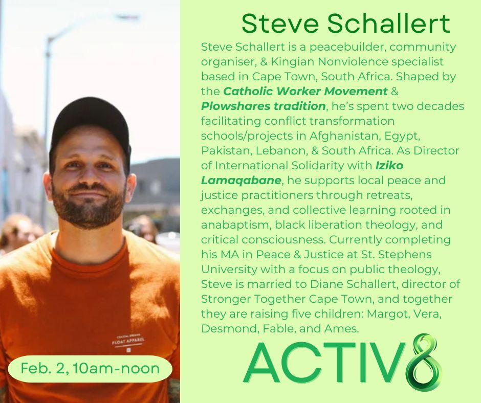Participation in the Activ8 Learning Community: Weekly meetings allow participants to build a sense of community with one another – sharing learnings and challenges. Meetings will be held in-person or online, include speaker sessions, movies, prayer times, and worship. Includes project research and reflection, about 5-10 hours per week.