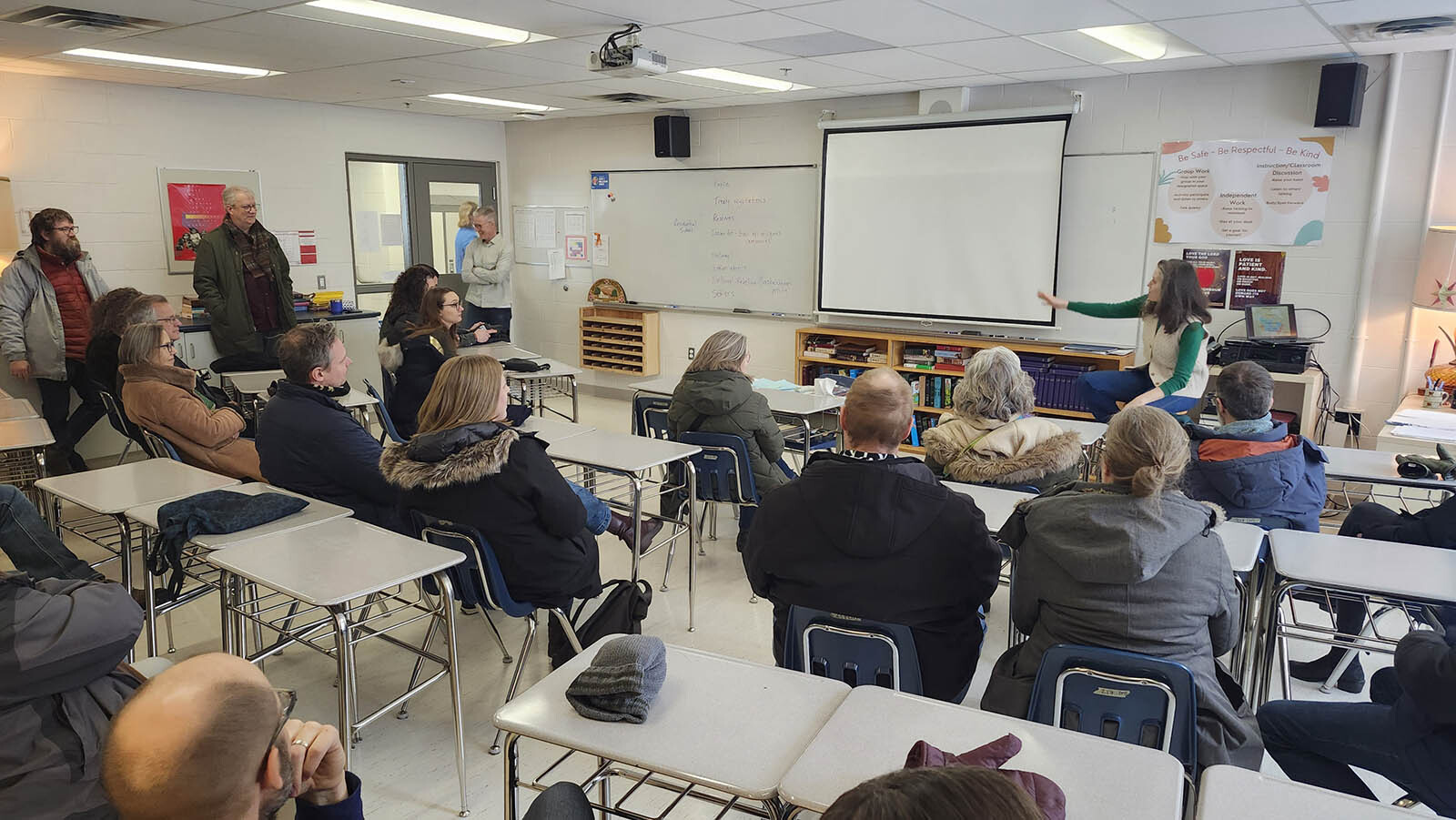 A walk to Westgate Mennonite Collegiate followed, where principal James Friesen (Charleswood) led the group on a tour of the facilities which included sitting in on choir and band classes. From the windows of Westgate’s chapel, the pastors could see across the Assiniboine River to where CMBC moved next, in what is now Munson Park. To close the tour, Westgate teacher Julia Thiessen (Charleswood) shared with the pastors aspects of the school’s religion curriculum and spiritual life programming.